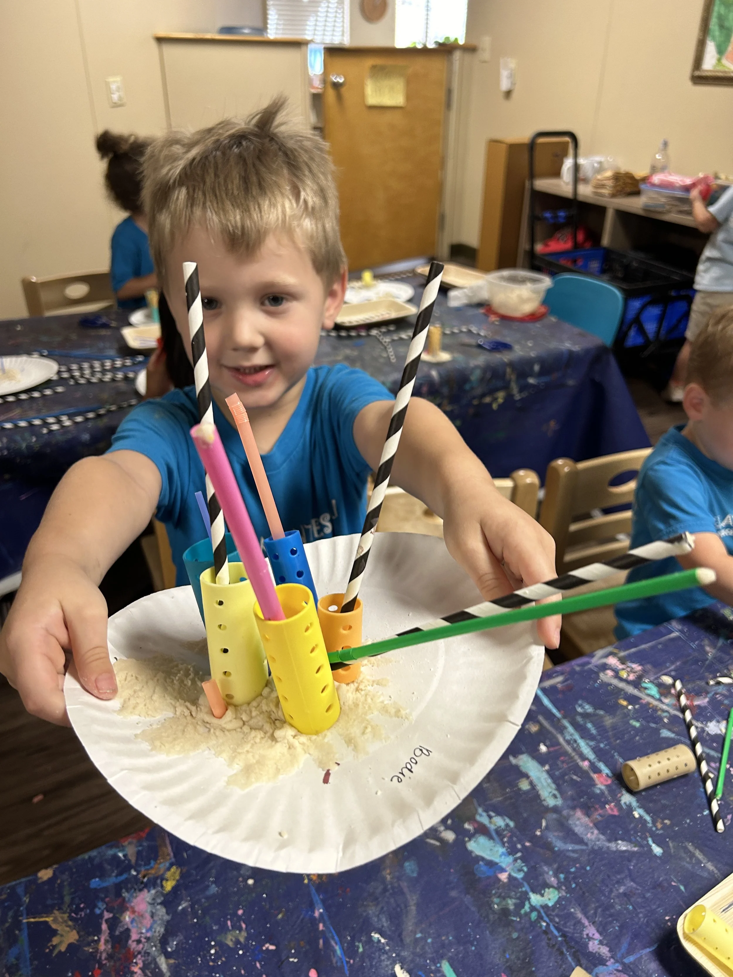 We presented a small ball of play-dough on a paper plate. Then we added in straws. We also provided scissors so they could cut the straws to their desired length.